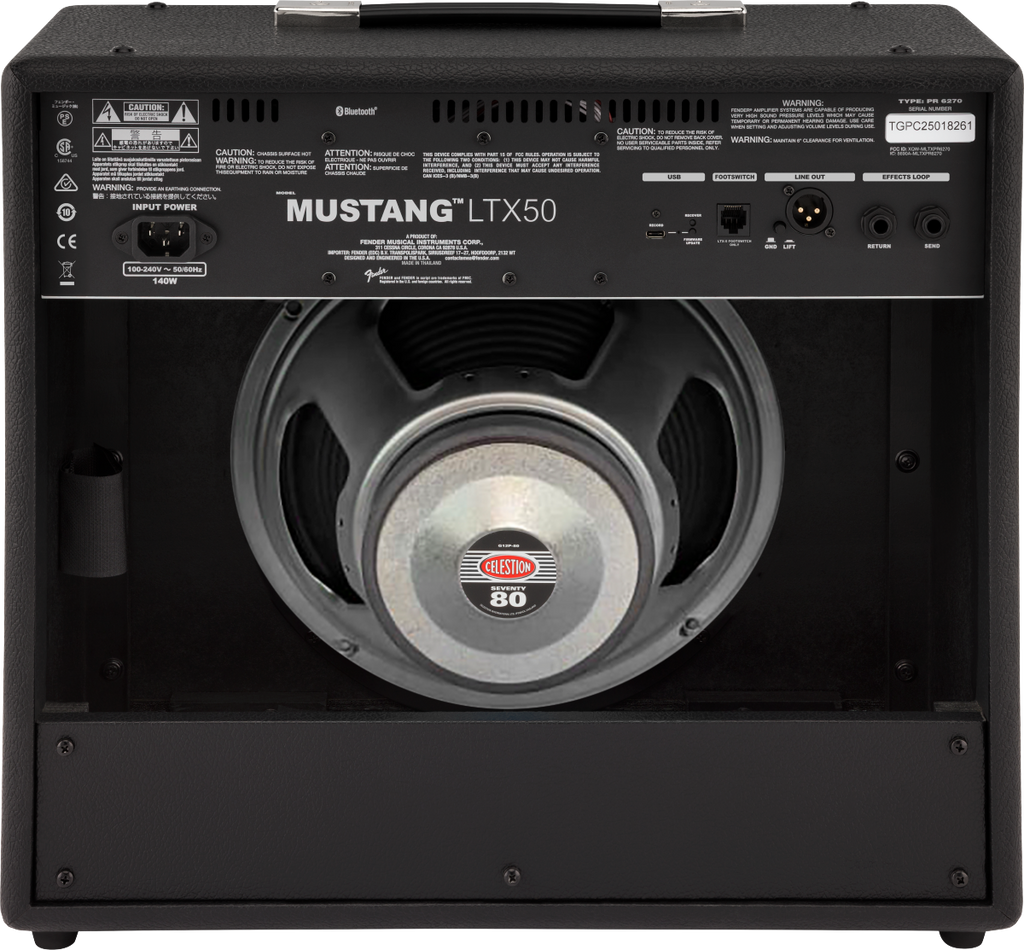 Mustang® LTX 50 is ideal for practice or performance with a 12" Celestion® G12P-80 speaker and an optional gig-ready 5-button footswitch. Onboard Bluetooth® allows you to jam along with your favorite songs as well as create, edit, download and share presets using the Fender TONE® app.