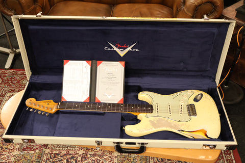 Used Fender 1963 reissue Stratocaster Olympic White over Sunburst  Masterbuild by Kyle Mcmillin in Ultimate Relic ithis is as nice as it gets.