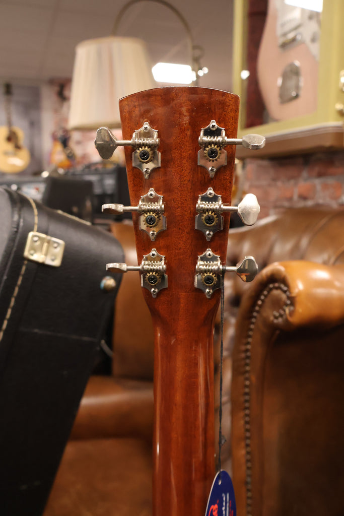 Features like a select solid Sitka spruce top, mahogany back, sides, neck and rosewood fingerboard and peghead overlay combined with a host of other gorgeous accouterments like multi-ply body binding, Mother-Of-Pearl inlays, and nickel-plated Kluson style tuners really make this a professional-level guitar at an extremely affordable price.