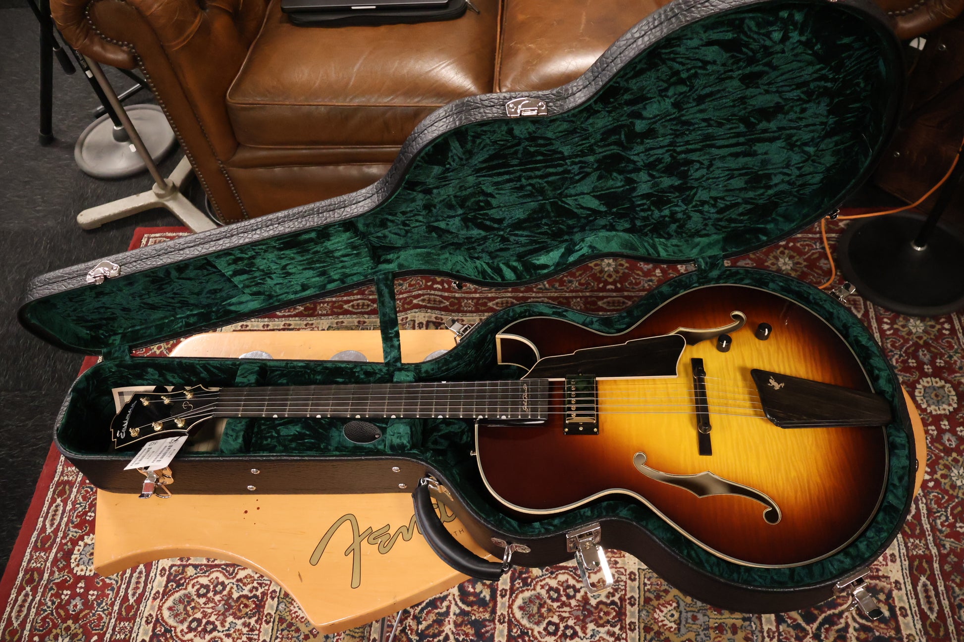 Brand new Eastman AR480CE John Pisano in B-Stock this one has a visual flow on the binding. Very little, but when you look close you see little scratches, saves you a lot of money on a new guitar