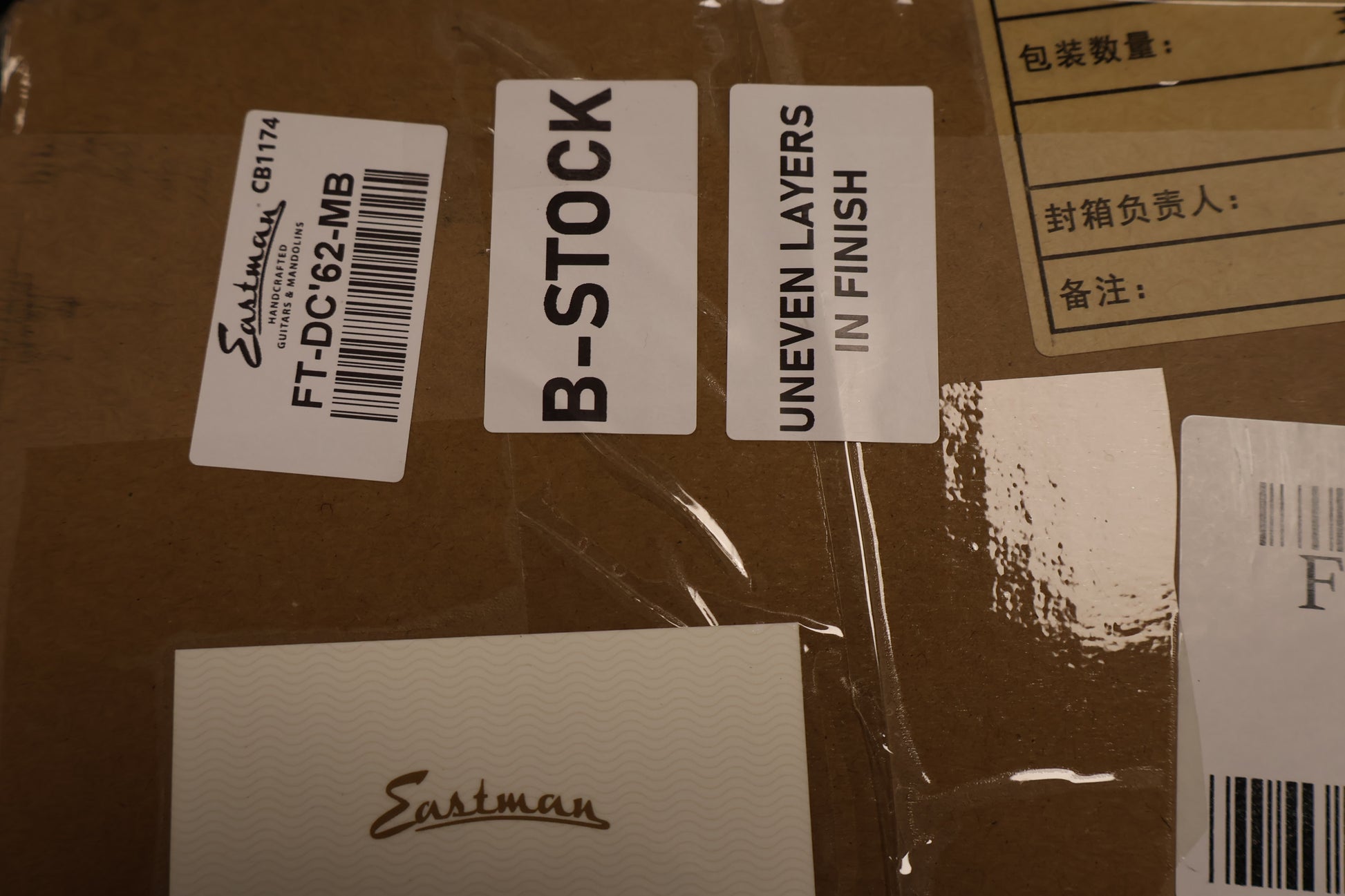 Brand new Eastman FT-DC'62-MB Fuller-tone Series DC Moss Black B-Stock model so this one has a visual flow. Very easy on black to see something you see some light strips, took pictures to show you. Saves you a lot of money. This wil also happen with a A stock after a week of playing.