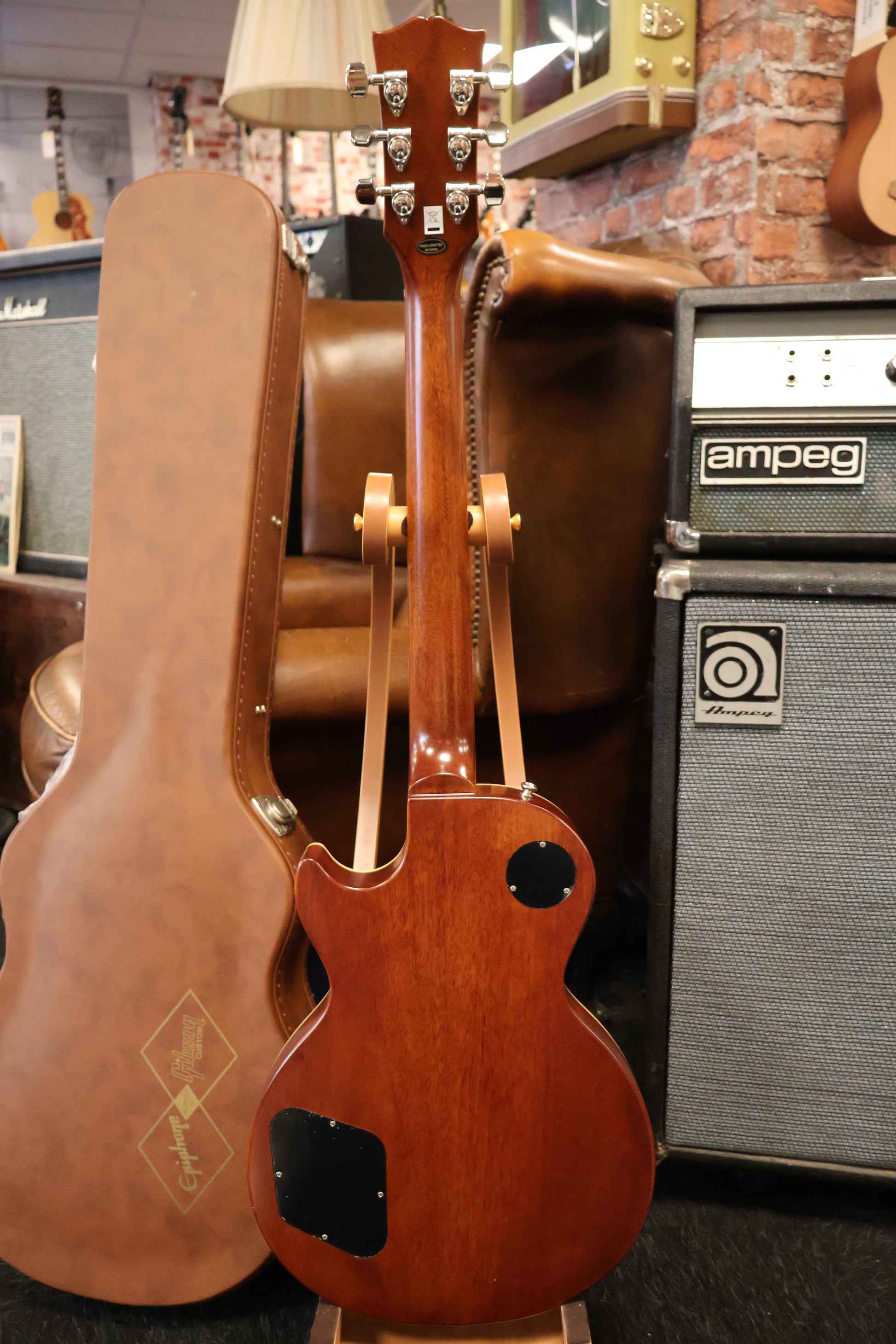 The story of “Greeny” is shrouded in mystery, but few guitars are as illustrious. Greeny is one of the most iconic original Les Paul™ Standards ever made, with a unique sound as recognizable as the guitar itself. Previously owned by Peter Green, it was used throughout his time with Fleetwood Mac and later sold to Gary Moore, who used it for three decades with Thin Lizzy and as a solo artist. Now owned by Kirk Hammett, Greeny has passed through the hands of three legendary guitarists. Its distinctive sound is partly from the out-of-phase middle switch position due to the neck pickup’s reversed magnetic polarity. The Epiphone Kirk Hammett "Greeny" Les Paul Standard is a collaboration between Epiphone and the Gibson Custom Shop. This exceptional guitar was inspired by Kirk's legendary original and allows players around the world the opportunity to experience some of the magic of "Greeny" for themselves. It features premium components, including Gibson USA Greenybucker pickups with the neck pickup reverse mounted and complete with a reverse polarity magnet, a Switchcraft® pickup selector and 1/4" output jack, CTS® potentiometers, Mallory™ capacitors, and Grover® Rotomatic® tuners with spade-style buttons on a Gibson-style “open book” headstock. A vintage-style brown and pink hardshell case is also included.