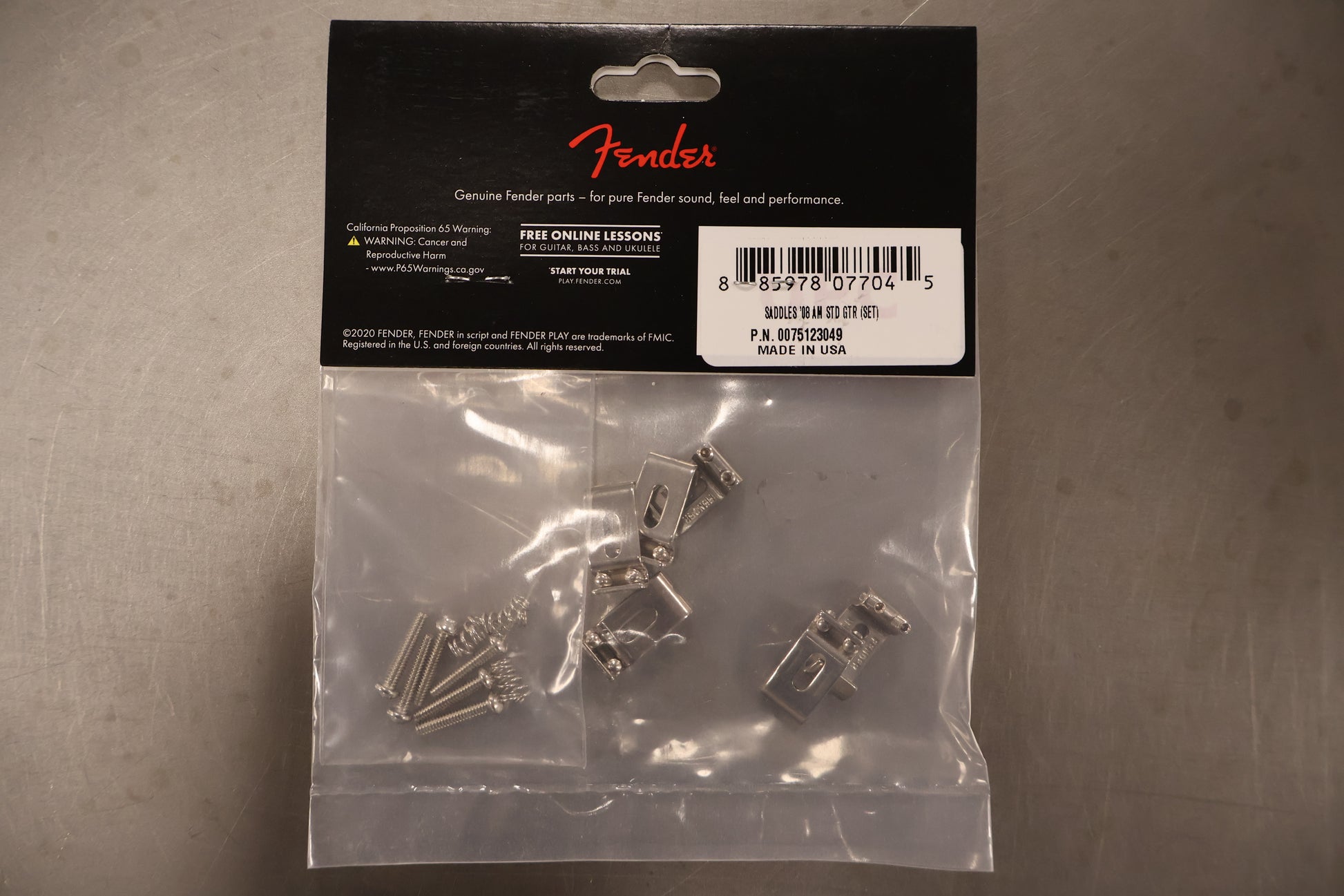 Bridge saddle kit used on 2008 American Standard Stratocaster® made of bent steel with nickel finish. Fender stamped with "FENDER" and include height adjustemnt screws and intonation screws with springs. String spacing: 2 1/16".