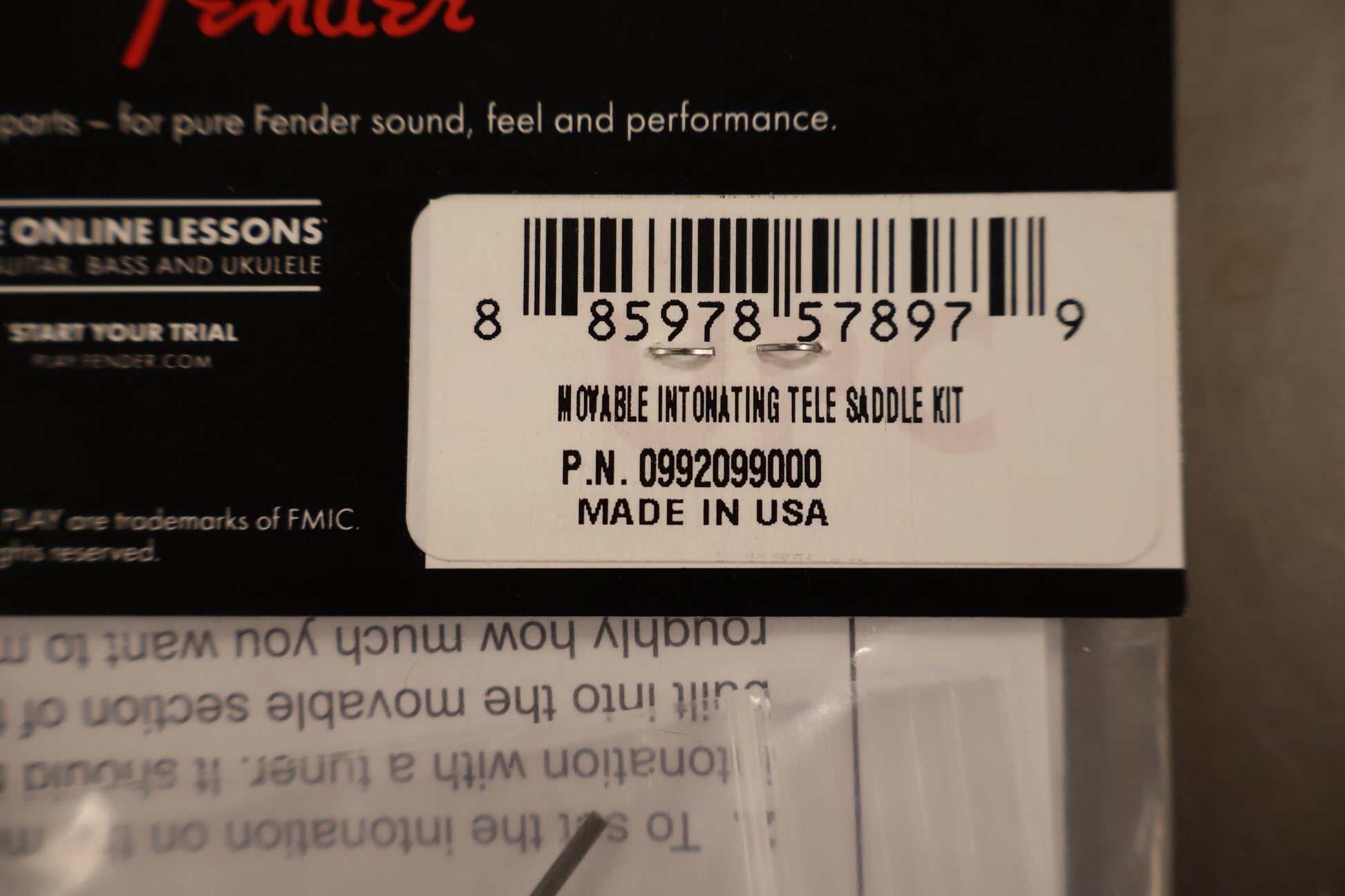Genuine Fender compensated vintage Telecaster saddle kit. Adjustable inserts allow for more exact string intonation but retain the vintage 3-saddle appearance and tone. Includes intonation springs, phillips intonation screws, and slotted height adjustment screws. Fits most vintage style Telecaster guitars with the three-saddle bridge design.