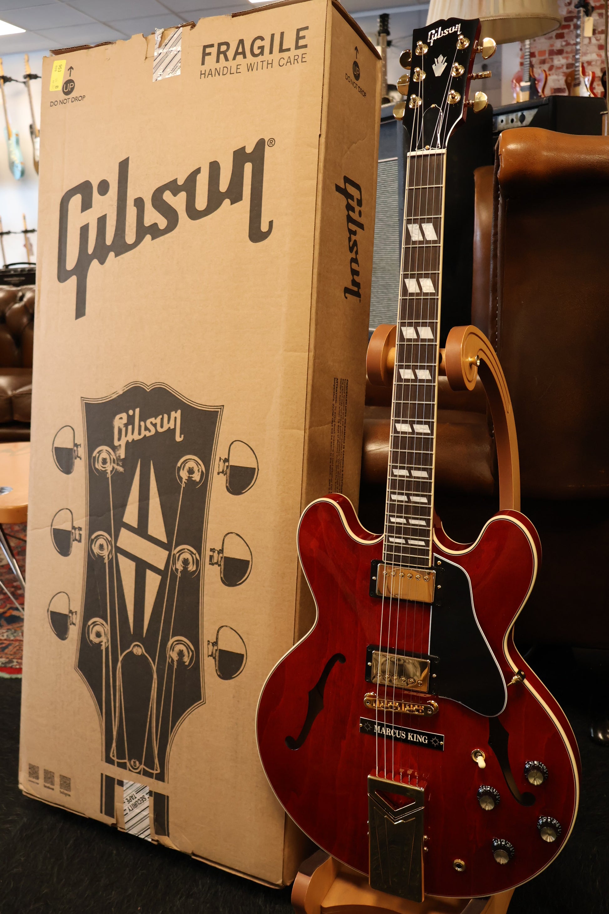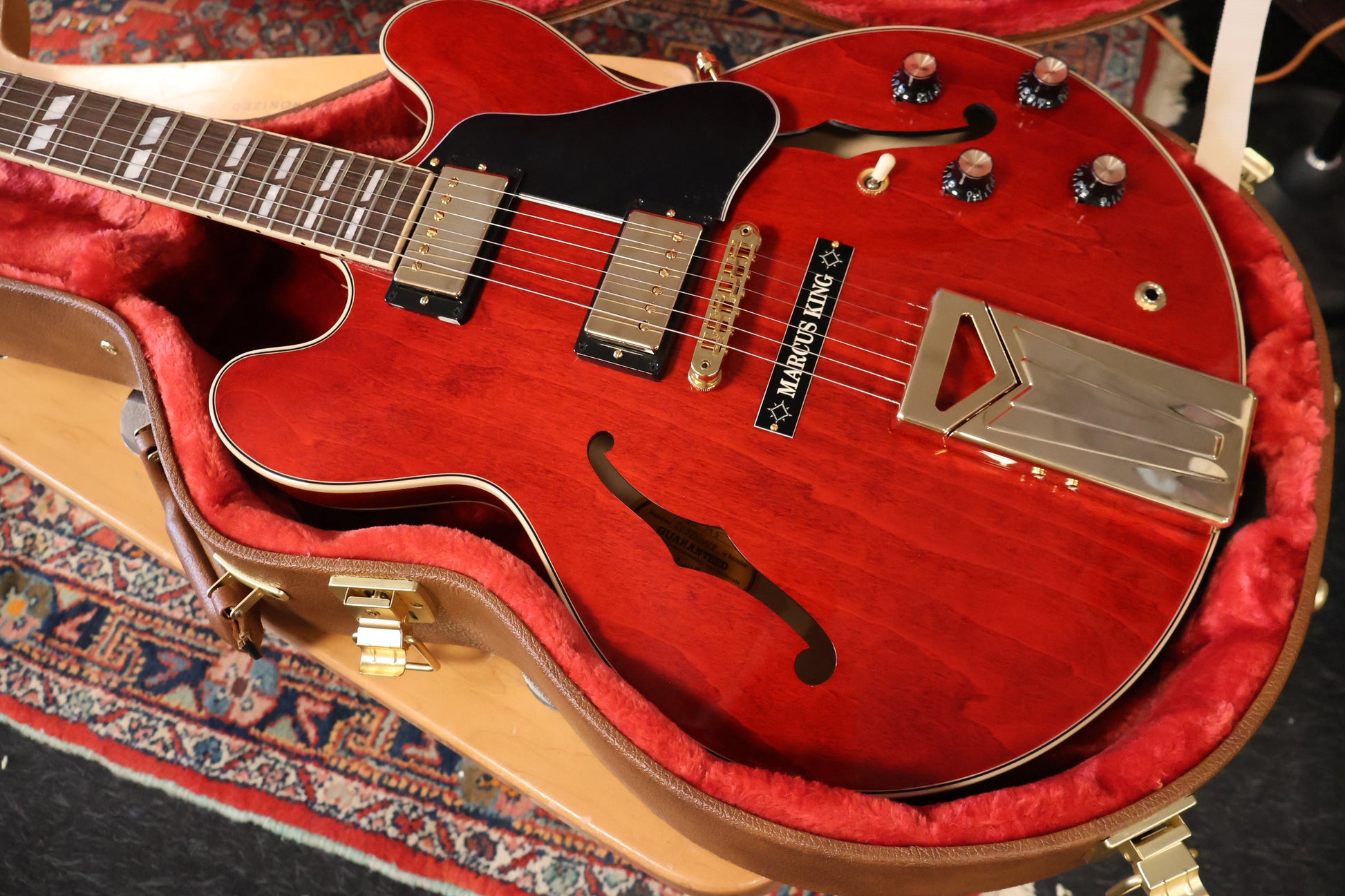 humbucker pickups, a fixed Vibrola tailpiece for improved tuning stability, and a stud anchor cover customized specifically for Marcus King. All of the standard ES-345 features that you’d expect a real so present, including the 3-ply maple/poplar/maplebody, solid maple centerblock for improved sustain and feedback resistance, and gold hardware, including an ABR-1 Tune-O-Matic bridge and Grover Rotomatic tuners with kidney buttons. The mahogany neck features a Rounded profile that averages. 875” at the first fret and .975" at the 12th fret. The Indian rosewood fretboard is a dorned with a crylic split parallelogram inlays and equipped with 22medium jumbo frets. A GraphTech nut adds to he tuning stability, and the guitaris finish edin classic Sixties Cherry. A Gibson hardshell case is included to keep the Marcus King ES-345 safe when it is stored or in transport.