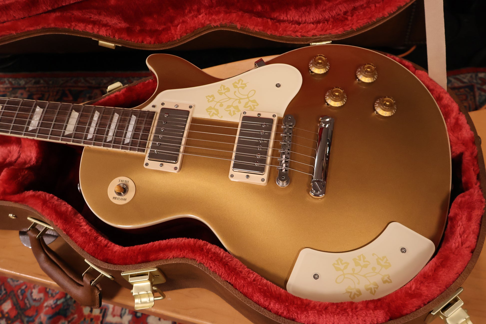 Born Iris Colleen Summers on July 7, 1924, Mary Ford was an accomplished guitarist, vocalist, and actress who was among the biggest recording artists of the early 1950s. Through her career in country music and her connections with Gene Autry and Eddie Dean, she developed a musical partnership with Gibson icon Les Paul that led to their marriage in 1949. In 1951 alone, the duo sold over six million records, and between 1950 and 1954, they recorded a string of 16 top-ten hits that showcased Mary’s rich, smooth voice, complex, perfectly executed harmonies that she sang along with herself through multi-track recordi ng and overdubbing (a groundbreaking recording technique for the time), and versatile guitar playing that seamlessly blended country, jazz, and pop. In 1951, Mary and Les influenced the design of the ES-295 hollowbody with a custom order, which Mary often used. In 1958, it is believed that one Les Paul™ Goldtop model with an ES-295-style floral pickguard and matching armrest was made at the request of Mary Ford. Now, Gibson is proud to release the Mary Ford Les Paul Standard, based on that one-of-a-kind origi nal. The Goldtop finish is accented by a Vintage Cherry back—a rarity for a Goldtop model. In addition to the cream and gold floral pickguard and armrest, it also features a mahogany body with a maple cap, a mahogany neck with a rosewood fretboard and SlimTaper™ profile, and is powered by a pair of Burstbucker™ pickups, with a Burstbucker 2 in the neck position and a Burstbucker 3 in the bridge position. A hardshell case completes this offering that honors one of the most beloved and innovative artists of the 20th century