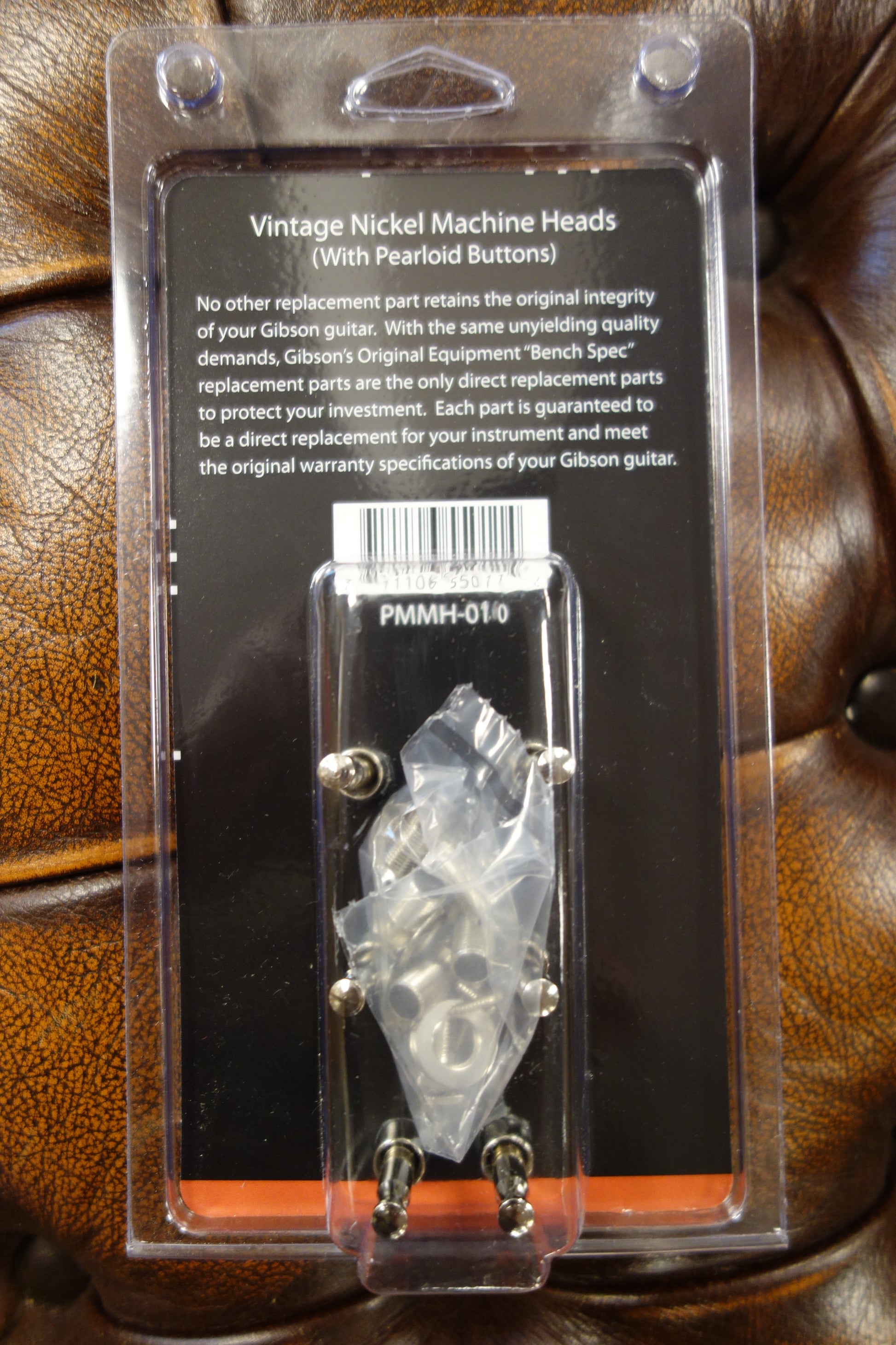 Gibson's vintage machine heads with pearloid buttons feature solid nickel, closed housing construction, period-correct vintage styling, and traditional pearloid buttons that deliver precise tuning, while adding a luxurious, classic feel to your guitar's headstock. This OEM part comes in Nickel finish. Special note: These tuners feature screw in bushings, which require a larger diameter mounting hole than traditional 'push in' bushing tuners.