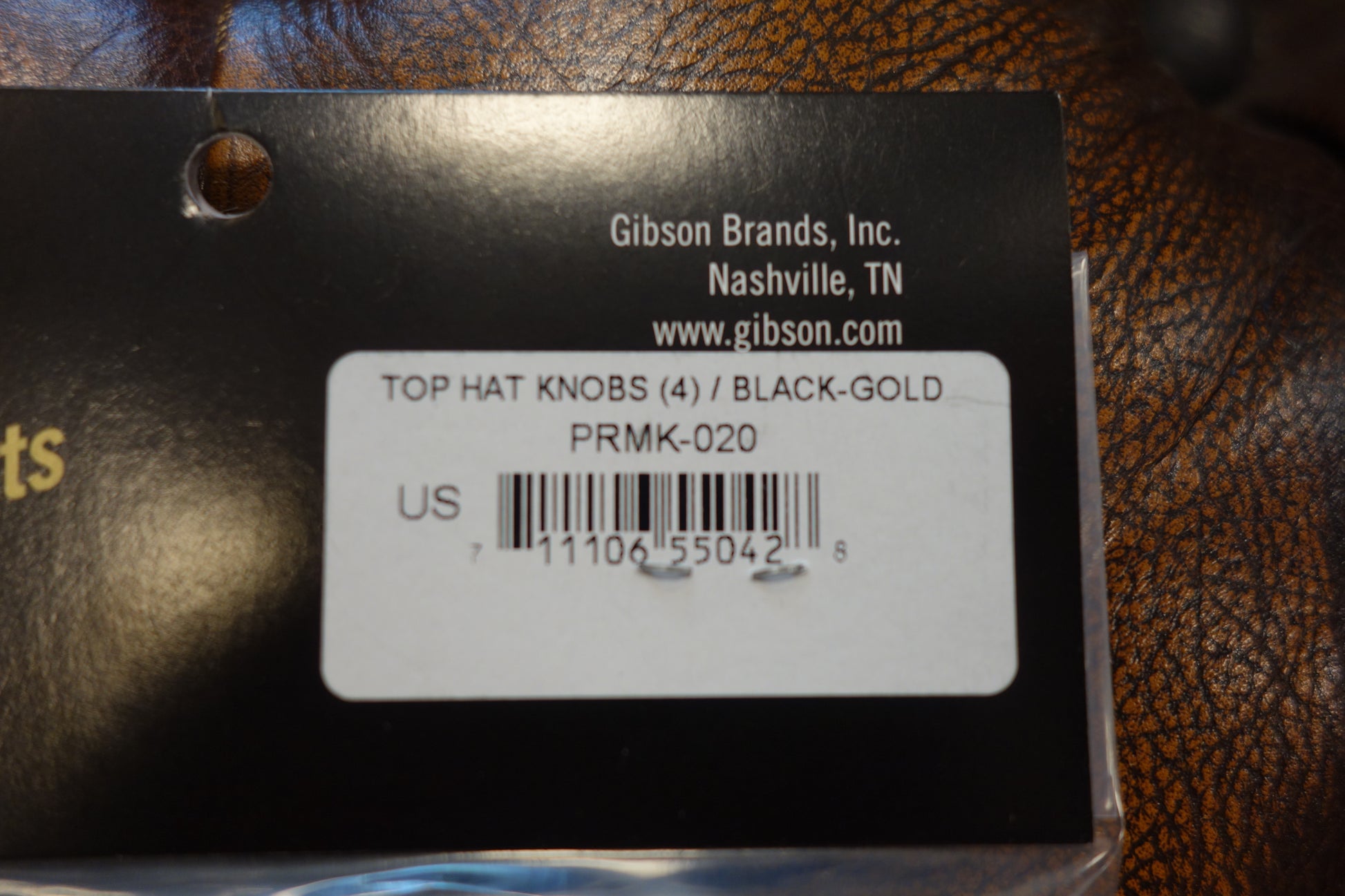 These genuine Gibson OEM top hat style knobs are the same knobs found on many Gibson SG models, but can also be used for any vintage restoration project, changing your guitar's look, or for the replacement of lost knobs. These black Gibson top hat style knobs with Gold metal inserts come packaged in sets of four: two volume and two tone.