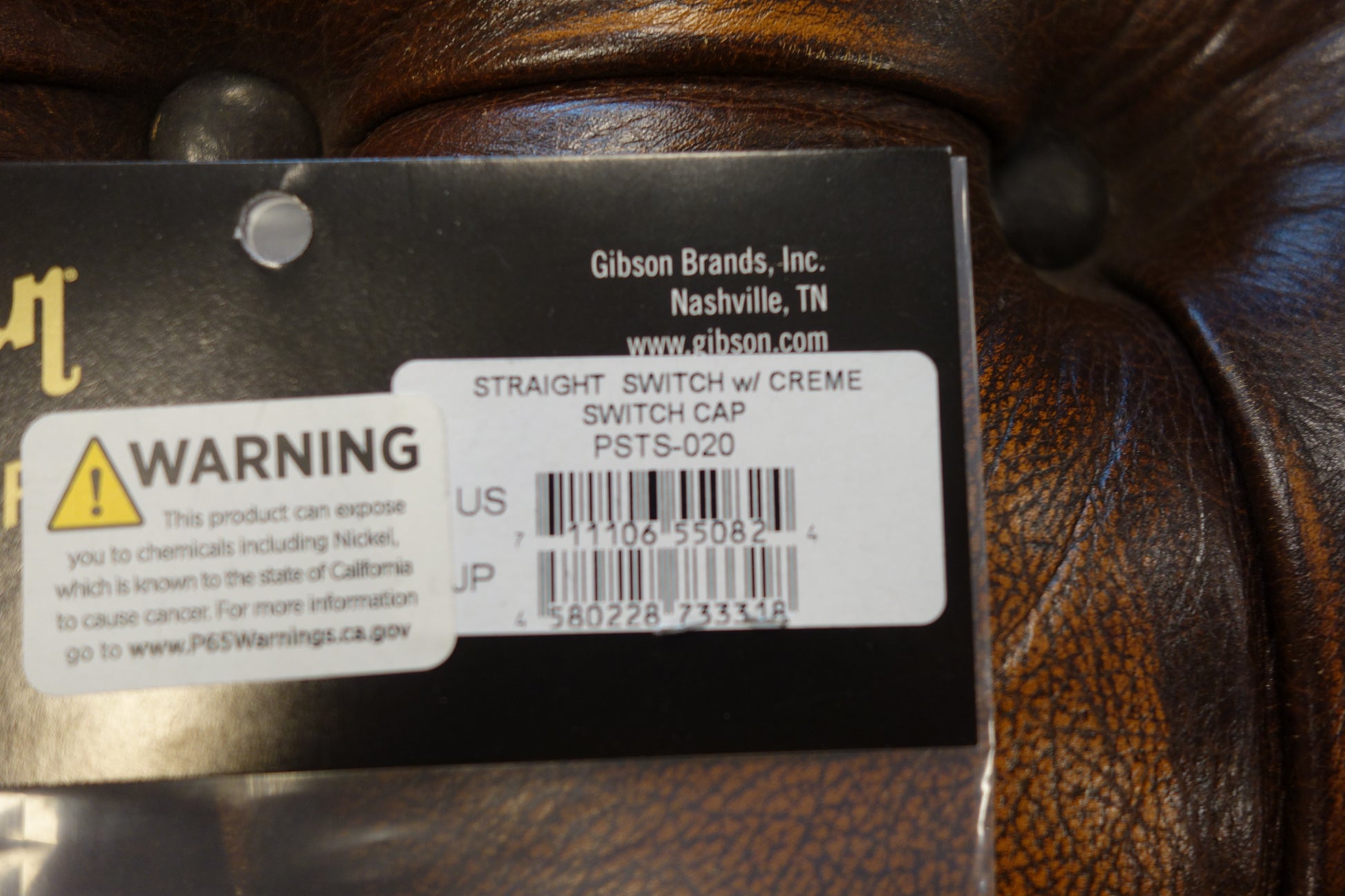 An original Gibson OEM replacement or restoration straight-type toggle switch pickup selector designed to fit all vintage and modern day Les Paul Standards and Studios. Comes with a crème switch cap.