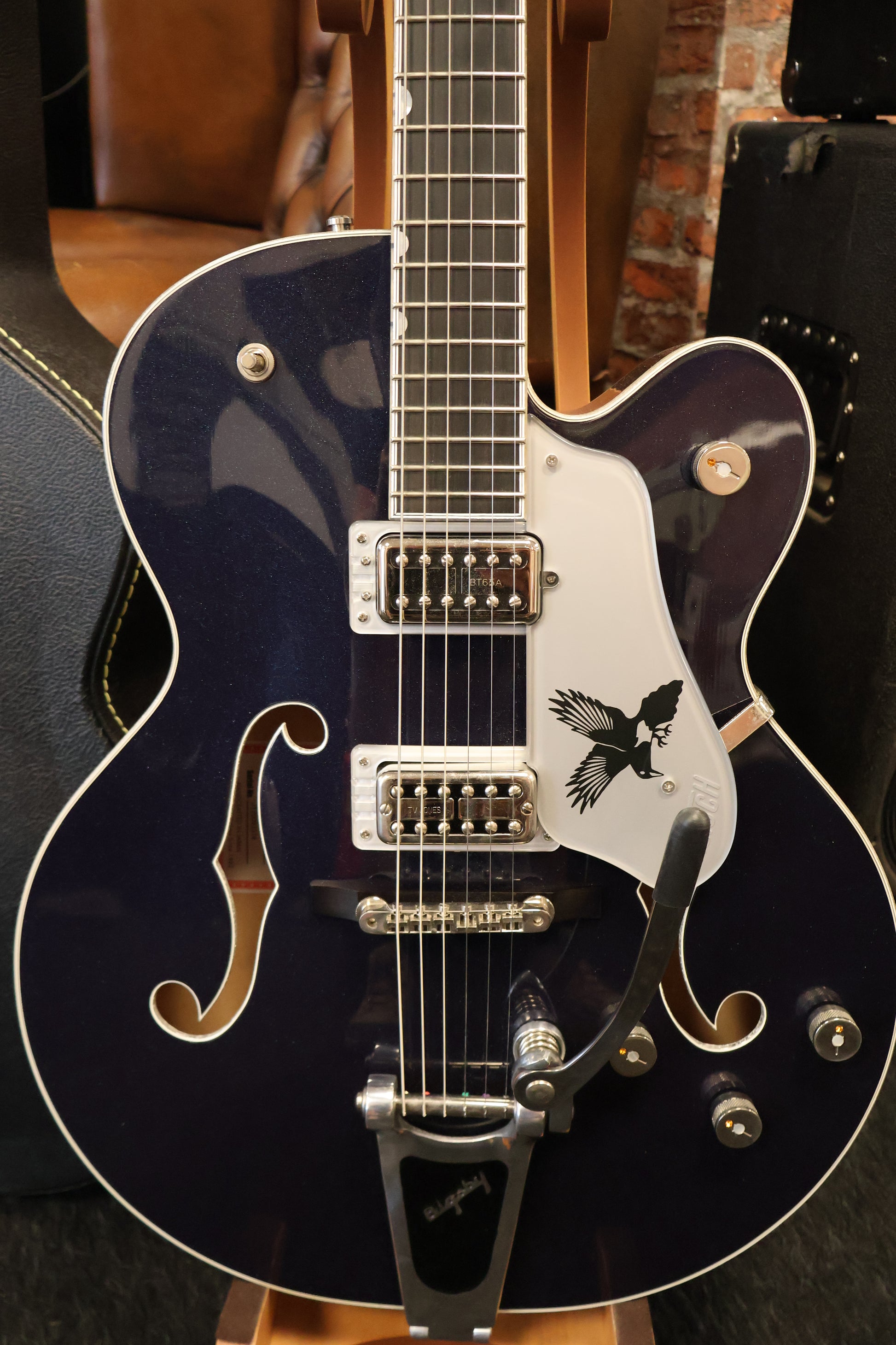 The G6136T is the epitome of style with a Raven's Breast Blue gloss lacquer finish, silver pickguard adorned with Magpie logo, silver sparkle body and neck binding and nickel hardware. Other premium features include Grover® Imperial™ tuning machines, amber jeweled G-arrow control knobs, bone nut, Adjusto-Matic™ bridge with pinned ebony base and string-thru Bigsby® B6 tailpiece.