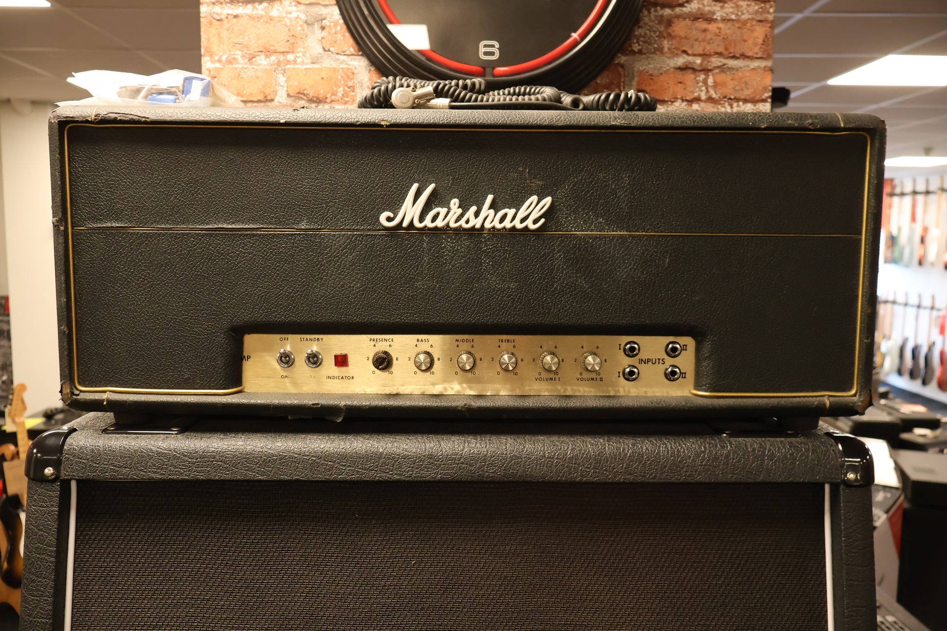 Cabinets are not vintage but a 1960a Vintage from around 2005 and a 1960B cabinet from around the same time. Original 220 volt version, housing from head has been switched in the past with a plexi model from the same period of time. Marshall logo is not original.