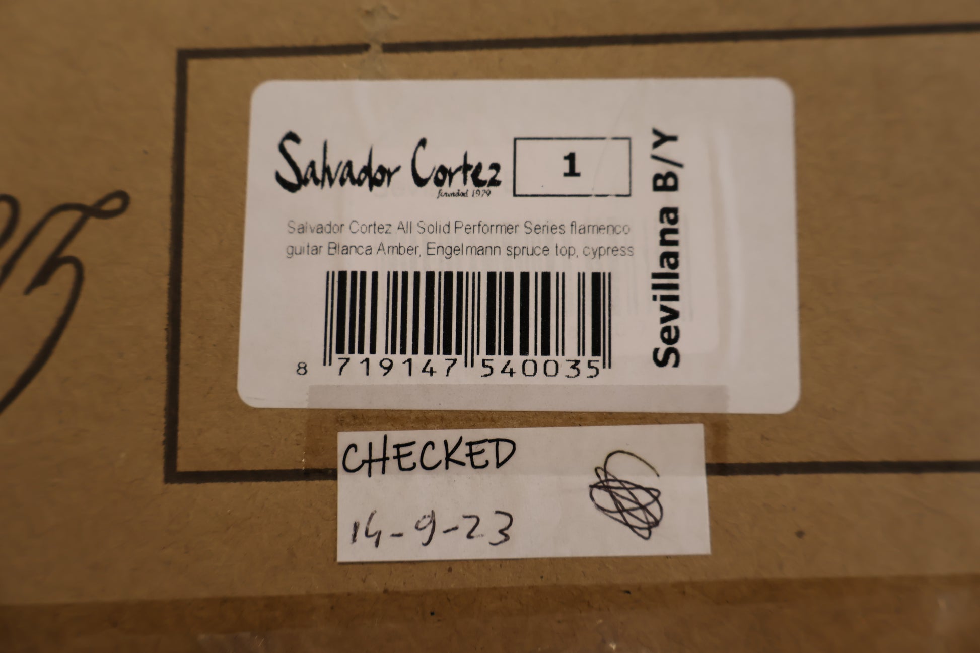 Brand new Salvador Cortez All Solid Performer Series flamenco guitar Blanca Amber, Engelmann spruce top, cypress b&s, fan bracing, deluxe gigbag